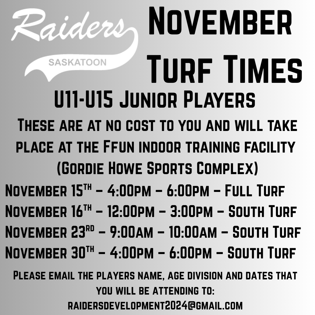 We have some upcoming turf times for our Raiders Junior Players U11-U15 (this would include any U9's that would be moving up to U11 in the spring)